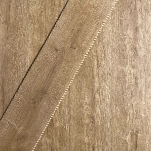 Piso flotante biselado color roble crudo, alto tráfico, disponible para venta o instalación.